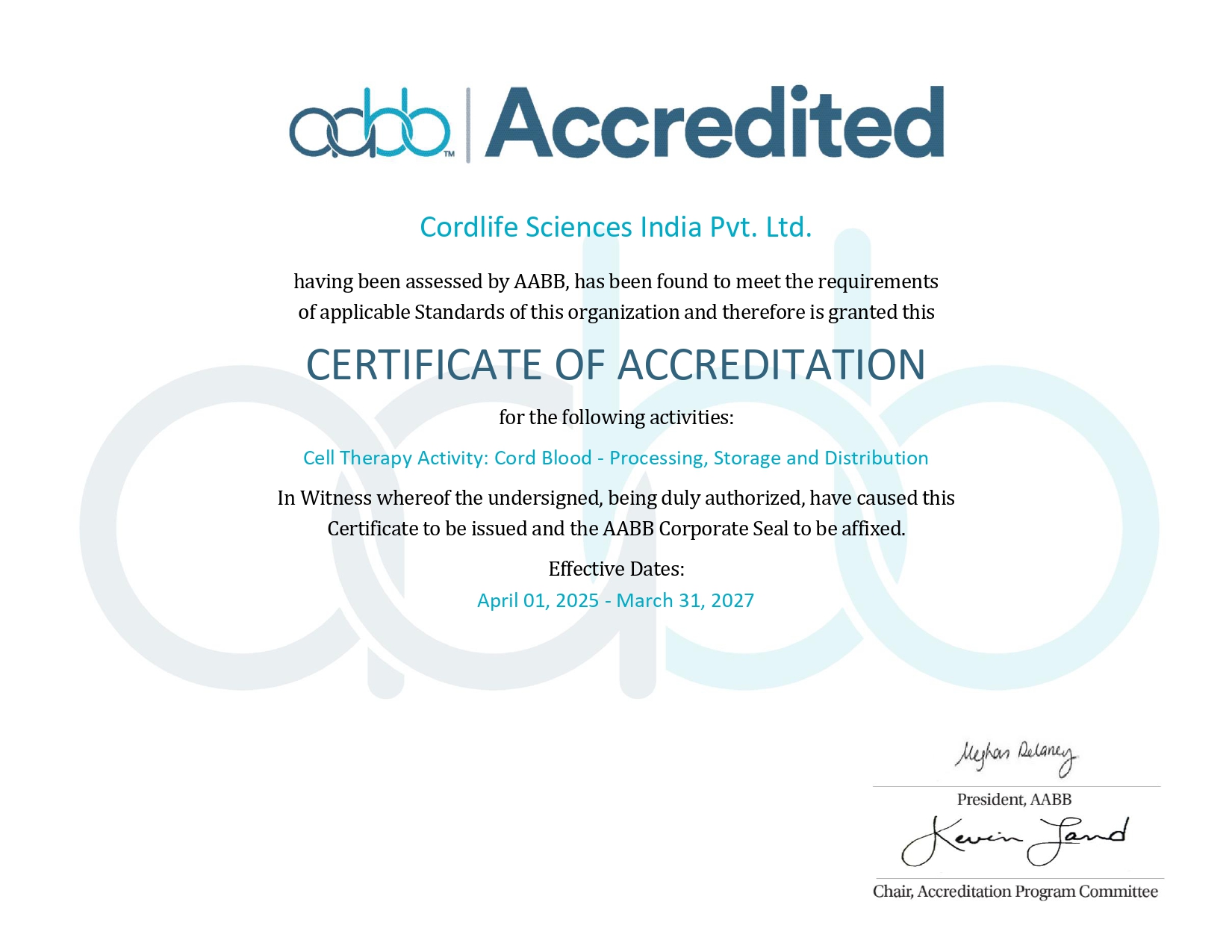 In October 2023, the global AABB accreditation was awarded to Cordlife after the new banking facility was determined to have met or exceeded the stringent standards set by AABB, following a rigorous on-site audit conducted by trained AABB assessors.