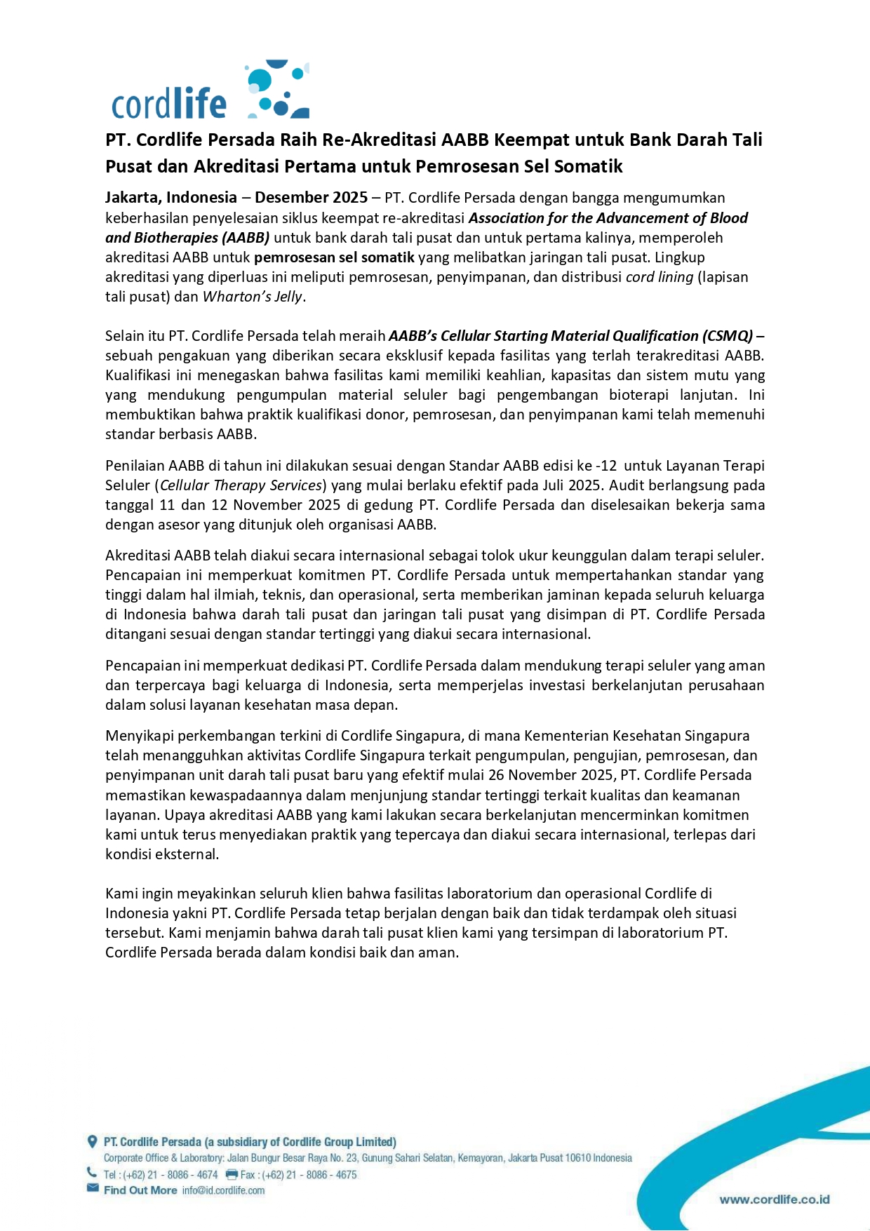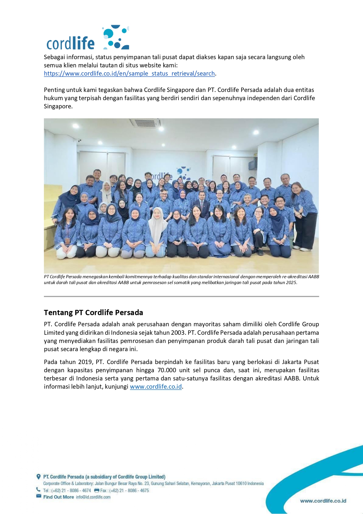 PT Cordlife Persada, bersertifikat ISO 9001, dan sebagai bank darah tali pusat pertama di Indonesia yang meraih akreditasi AABB global.