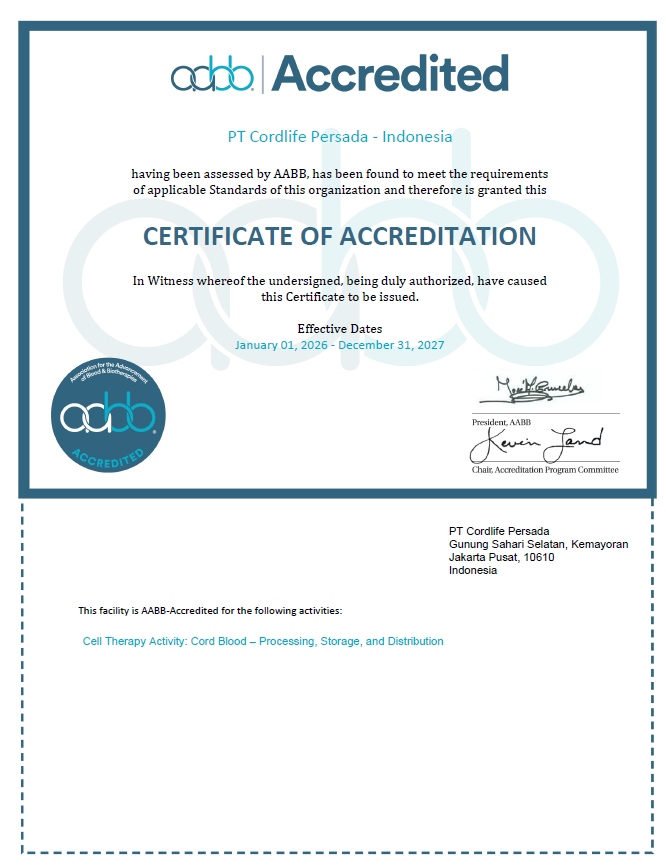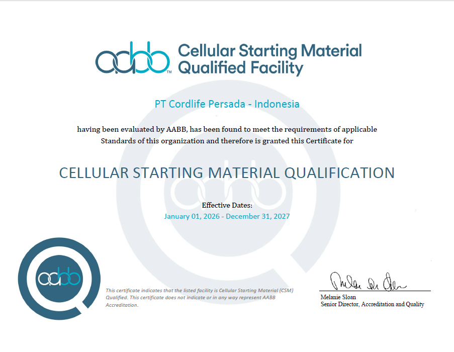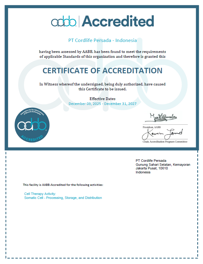 Pada Desember 2025, PT Cordlife Persada berhasil menyelesaikan siklus keempat re-akreditasi AABB untuk bank darah tali pusat dan untuk pertama kalinya meraih akreditasi AABB untuk pemrosesan sel somatik dari jaringan tali pusat, mencakup pemrosesan, penyimpanan, dan distribusi cord lining serta Wharton’s Jelly. Selain itu, Cordlife juga memperoleh AABB Cellular Starting Material Qualification (CSMQ), menegaskan bahwa fasilitas kami memenuhi standar AABB dalam kualifikasi donor, pemrosesan, dan penyimpanan material seluler untuk mendukung pengembangan bioterapi lanjutan.